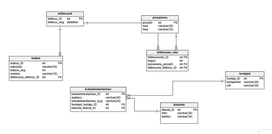 - pizzamenu_pizzaID tabelis tellimusse_rida viitab tabelile pizzamenu